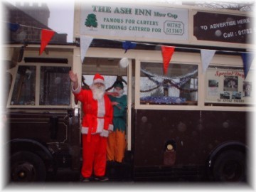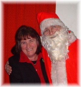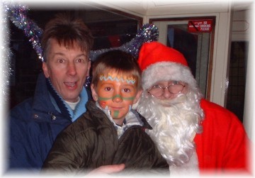 Santa and an Elf arrived on top of Lenny's 1930's style open topped bus. Santa informs me that the journey up to the Church was bitterly cold, and that people who thought he was waving never realised he was just shivering. The children did not have to pay and see Santa and all under 11's got a present as well, and they were good quality as well. Horace and Des braved the cold chill without the aid of a fur covered suit and ran the BBQ outside under a gazebo, while inside the others played giant connect 4 against Chris the Clown. |